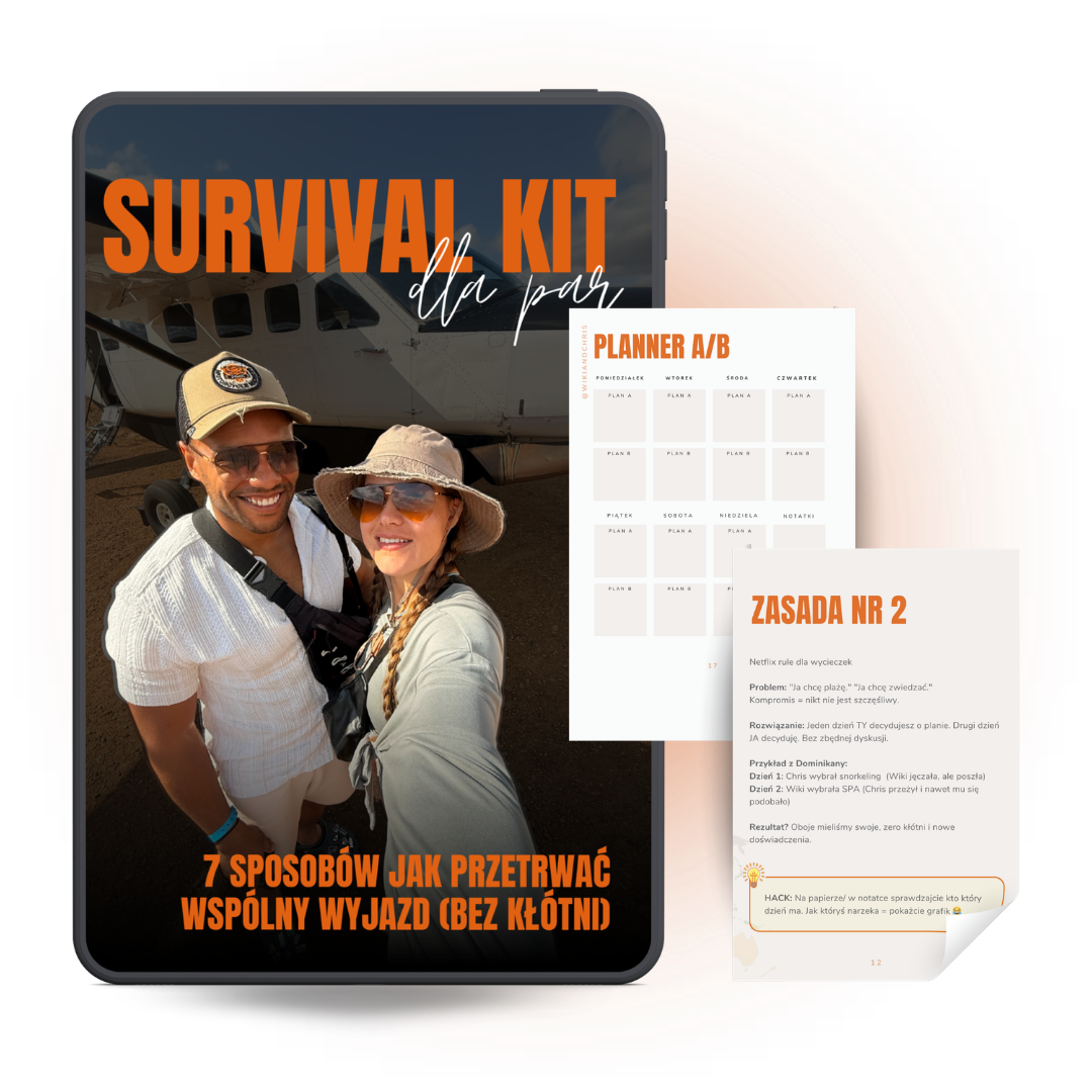 Odbierz darmowy Survival Kit dla par w podróży. 7 sposobów jak przetrwać wspólny wyjazd bez kłótni i wrócić z ochotą na kolejny. PDF trafi na Twoją skrzynkę w ciągu 2 minut.